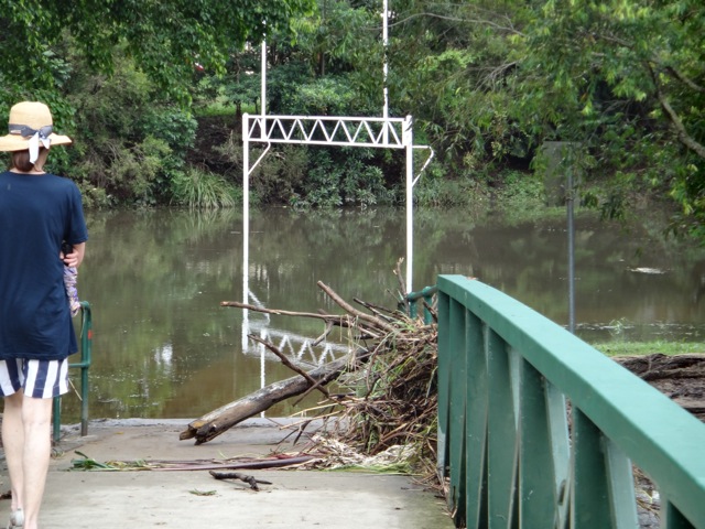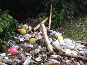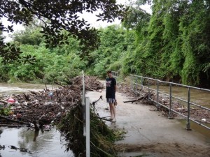 A torrent of muddy water was swirling around an enormous pile of debris consisting of uprooted weeds, bamboo, tree branches, enough rubber balls of varying origins to outfit an entire primary school and an enormous number of plastic bottles discarded by lazy drinkers. It was obvious from the amount of water on the local playing field and the pile of debris jammed against the bridges, that it had broken its banks.
