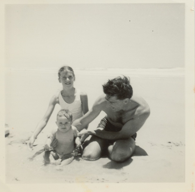 Fortunately I found other slides which bring back much more pleasant memories of swimming beside my father in the surf, going right out the back with him, totally fearless as we caught enormous waves into the beach. He taught me how to plunge under a wave, digging my hands into the sand to avoid being dumped; watching the bubbles float so that I knew which way was up. I wasn’t quite so fearless as we swam across the Nerang River but where he swam, so did I although I was quite convinced a shark was going to get me.